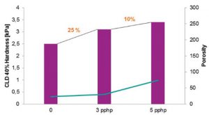 如圖1所示,在參考配方實驗室條件下,密度為16kg/m3海綿中添加3pphp和5pphp 的nt h18,其硬度增加達到25%和35%。