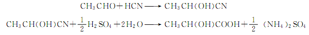 將乙醛和冷的氫氰酸連續(xù)送入反應(yīng)器生成乳腈,再用泵壓入水解釜,并加入水和催化水解得乳酸;加乙醇酯化后精餾分出乳酸乙酯;后送入濃縮罐加熱分解而得精乳酸。